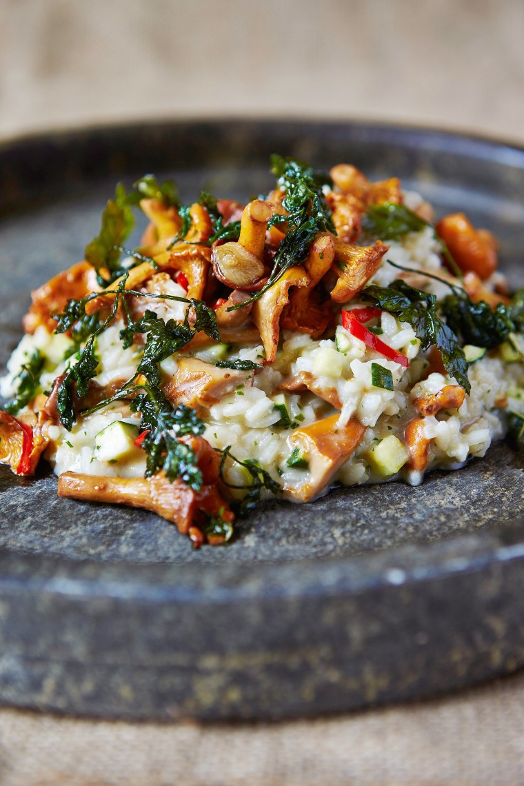 Tilsæt derefter den varme bouillon, så risene akkurat dækkes. Risene koges nu i 10-14 minutter, mens du løbende rører og tilsætter bouillon, og når risene stadig har lidt ‘bid’, vendes svampeblandingen, persille, timian, resten af chilien, fennikelblomst og reven parmesan i.