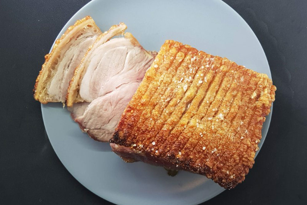 - Stegen jeg bruger er krogmodnet i 21 dage, hvilket gør at kødets smag er mere intens og at sværene har lettere ved at blive sprøde.