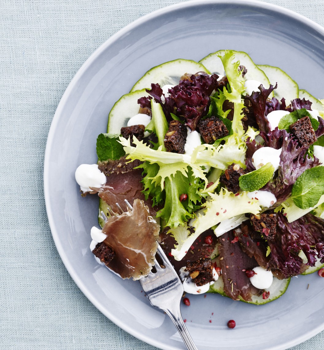 Skyl og pluk salaten i mundrette stykker. Skær agurken i tynde skiver og læg dem i bunden af fadet eller på en tallerken, hvis den skal serveres som portionsanrettet forret. Læg lammefilet skåret i tynde skiver, oven på agurken.