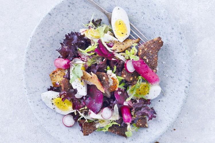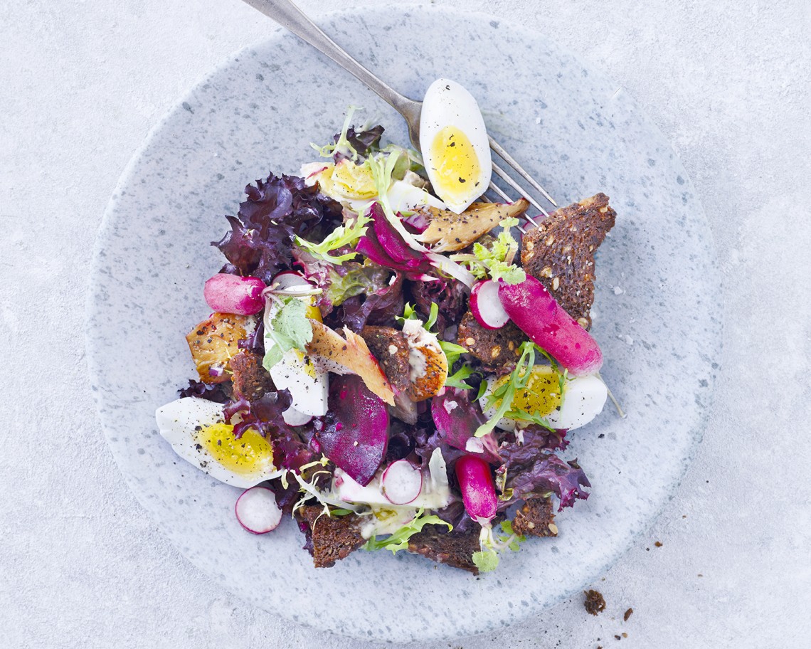 Anret nu salaten på et fad, bræk makrellen i små stykker, drys med rødbedeflager, hakket rødløg, kvarte smilende æg, rugbrødstern og estragon vinaigrette.