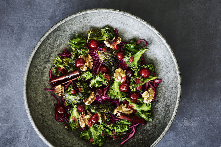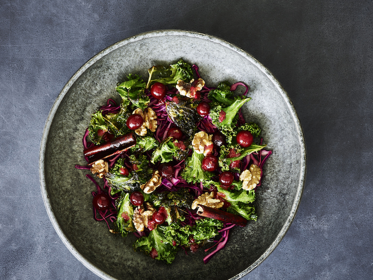 Giv julemaden et friskt pust med denne opskrift på salat med rød spidskål, ristet grønkål, syltede tranebær og valnødder.