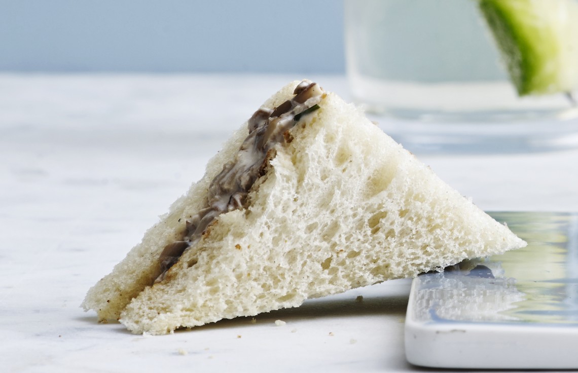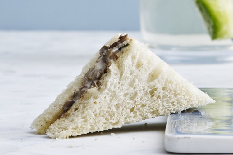 Vend de ristede svampe med flødeosten og trøffelolien. Lad det køle af og smør den ristede side af brødet og læg en skive oven på med den ristede side nedad.