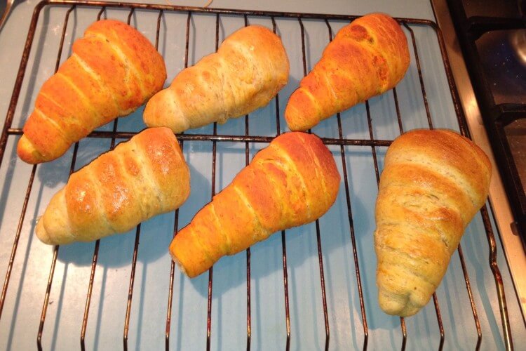 Hvis du gerne vil have orange brød, kan du enten blande rød og gul frugtfarve, eller gurkemeje, vand og lidt rødbedesaft, som du pensler brødene med.
