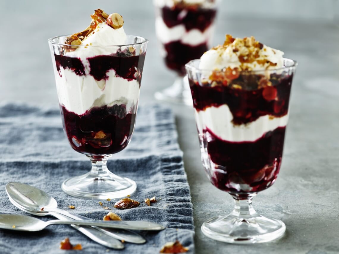 Tag 4 rødvinsglas. Start med at komme lidt nøddeknas i bunden, så skovbær, og til sidst cremen. Gentag processen til desserten er så stor, som du ønsker.