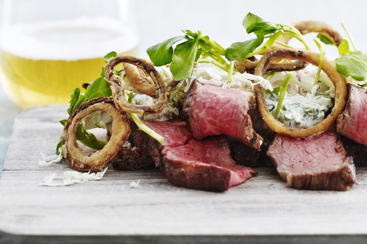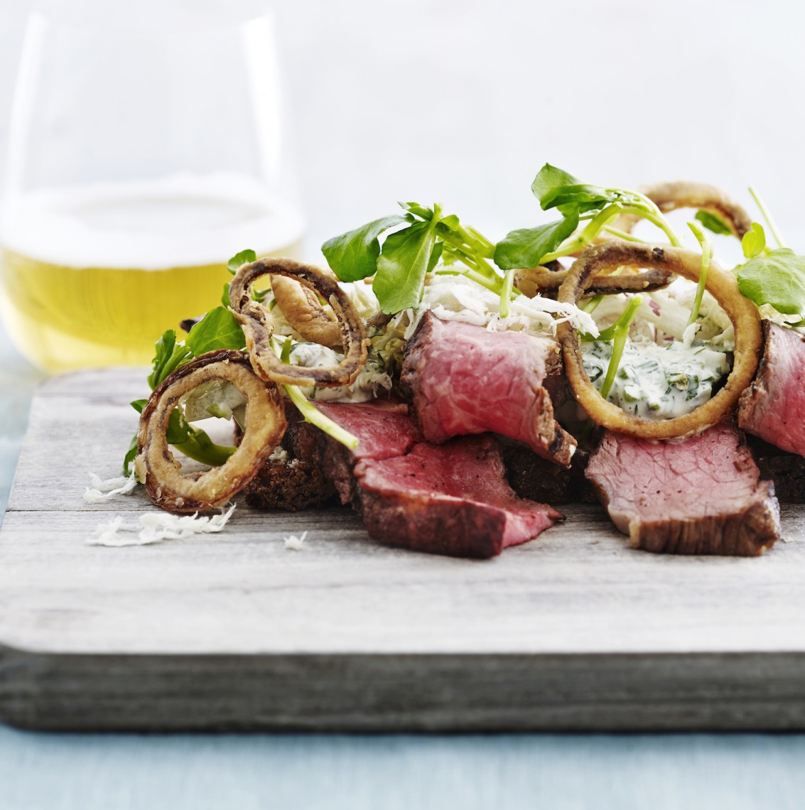 Stegt tyndsteg med peberrod, rodfrugtremoulade og sprøde løg