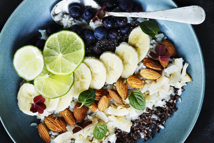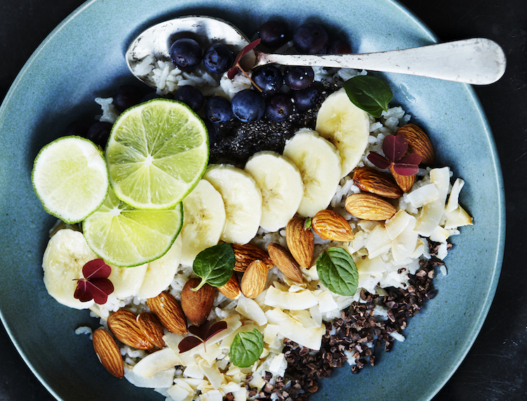 4. Anret risen i skåle og pynt med bananskiver, blåbær, mandler, chiafrø, kakaonibs og kokosflager.