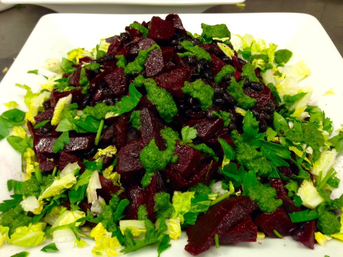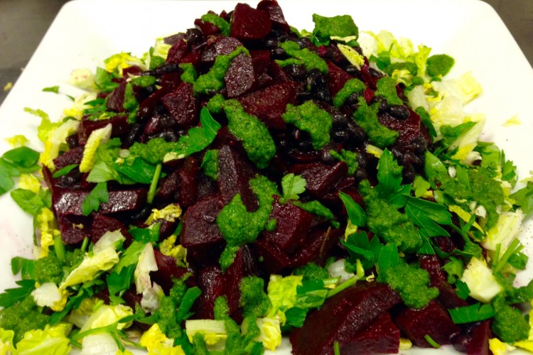 Vend de bagte rødbeder godt sammen med de kogte bønner, og køl dem let af. De må meget gerne være lune, når du serverer dem, så smager salaten bedre.