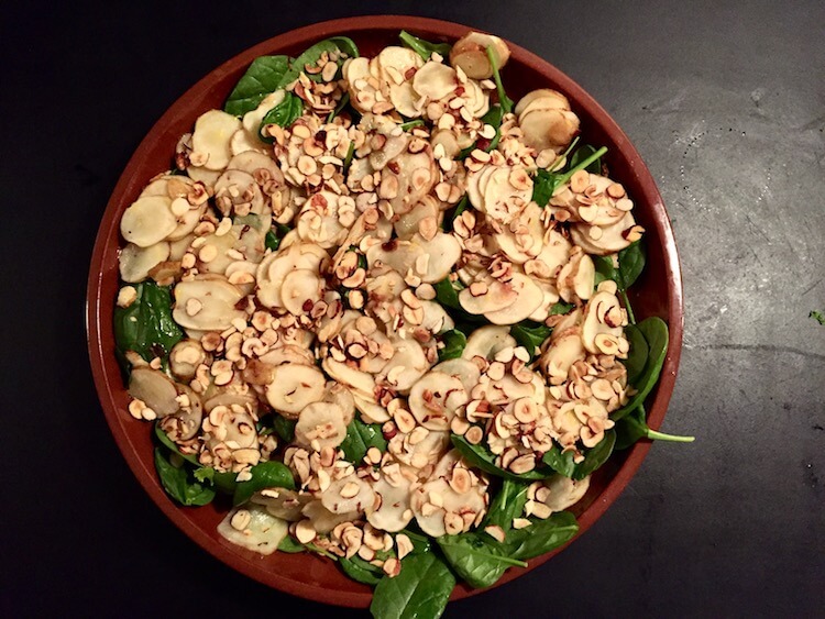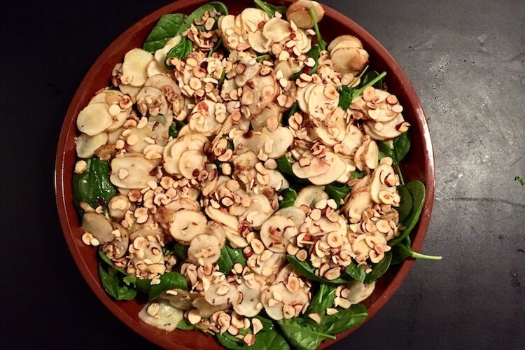 Lad dem trække i minimum 30 minutter. Rist hasselnøddeflagerne i ovnen på 180 grader i 6-8 minutter. Skyl spinaten og saml din salat.