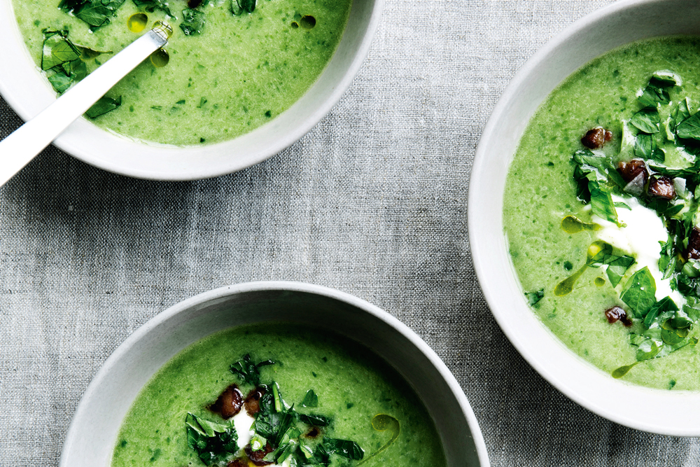 - Tilsæt grønkål og halvdelen af persillen, lad det koge i yderligere 3 minutters tid, eller til grønkålen er mør. Blend suppen, til den er jævn og smukt grøn. Smag til med salt, peber og evt. æbleeddike.